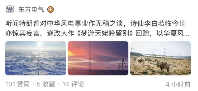 @东方电气 :听闻特朗普对中华风电事业作无稽之谈,诗仙李白若临今世亦惊其妄言。遂改大作《梦游天姥吟留别》回赠,以华夏风电事实驳信口雌黄之语。@中国大唐,你要的真·唐诗来啦!
