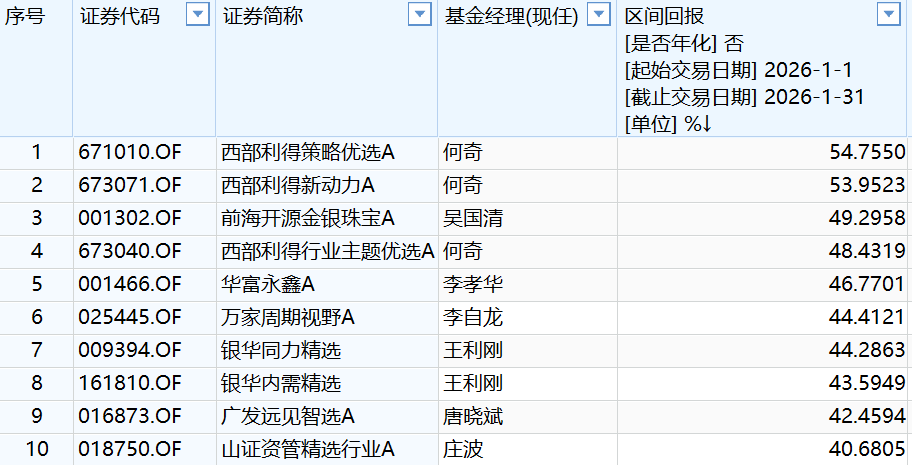 其中,基金经理何奇管理的西部利得策略优选和西部利得新动力,分别以54.76%和53.95%的收益率位列前两名;吴国清的前海开源金银珠宝以49.30%的收益率位列第三名。
