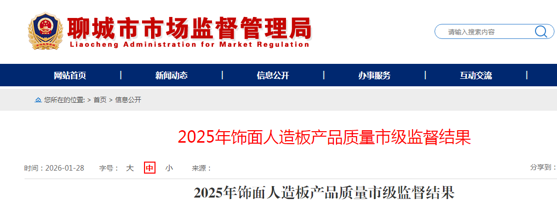 中国质量新闻网讯 据山东省聊城市市场监督管理局网站消息,近日,聊城市市场监督管理局公布2025年饰面人造板产品质量市级监督结果。本次共抽查生产领域、流通领域饰面人造板产品11批次。