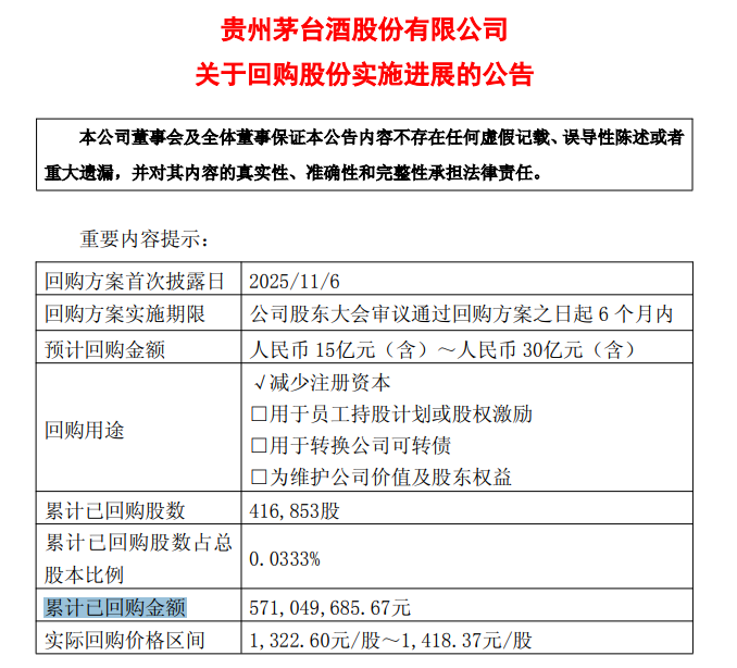 2月3日,贵州茅台(600519.SH)发布关于回购股份实施进展的公告,内容提到,2026年1月,公司累计回购股份329,794股,占公司总股本的比例为0.0263%,购买的最高价为1,418.37元/股、最低价为1,322.60元/股,支付的金额为450,946,692.58元。截至2026年1月底,公司已累计回购股份416,853股,占公司总股本的比例为0.0333%,购买的最高价为1,418.37元/股、最低价为1,322.60元/股,已支付的总金额为571,049,685.67元(不含交易费用)。
