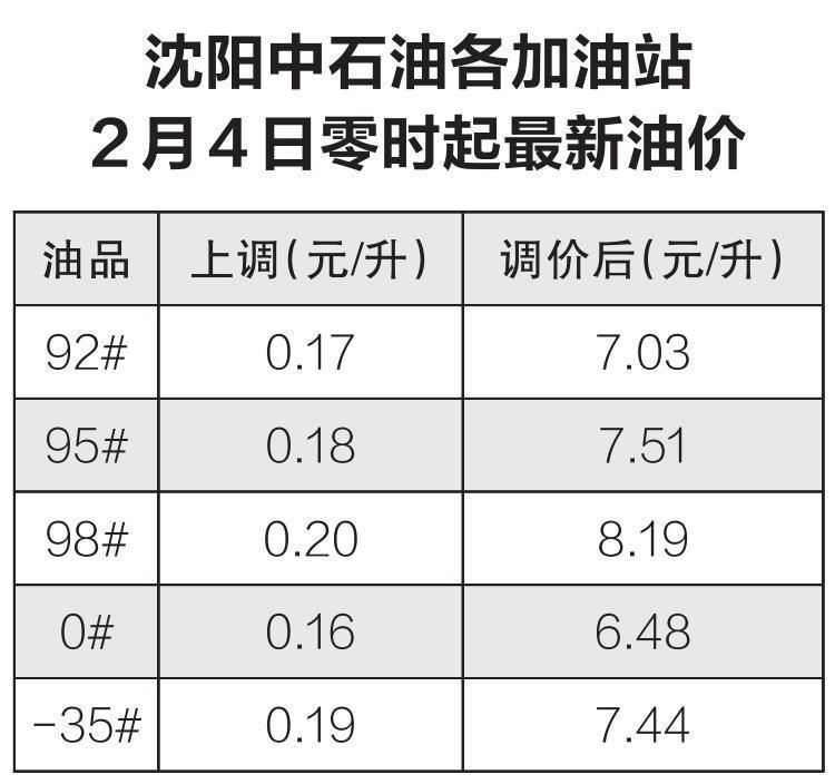 记者从中国石油辽宁沈阳销售分公司获悉,沈阳中石油各加油站已第一时间落实调价政策。具体来看,92#汽油上调0.17元/升,95#汽油上调0.18元/升,98#汽油上调0.20元/升,0#柴油上调0.16元/升,-35#柴油上调0.19元/升。