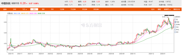 从2024年9月20 日的3.42元,到2026年2月4日的6.28元,不到一年半的时间内,东航涨幅高达84%。