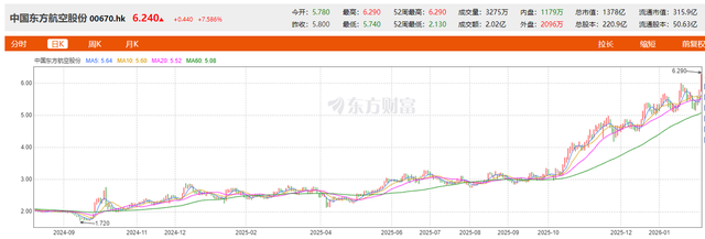 从2024年9月16 日的1.72元,到2026年2月4日的6.19港元,不到一年半的时间内,东航涨幅高达260%。