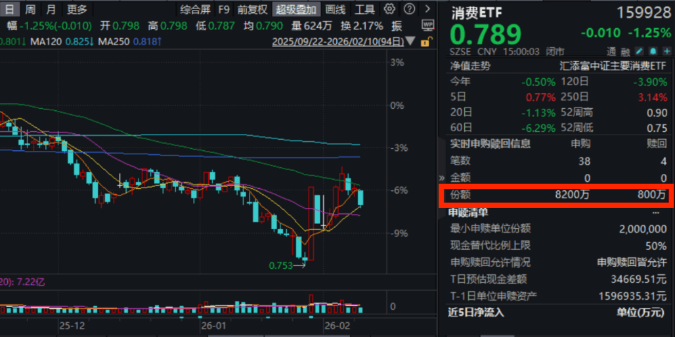 A股方面,规模领先的消费ETF(159928)收跌1.25%,全天成交额近5亿元!资金再度涌入,全天获净申购7400万份。热门成分股多数飘绿,安井食品跌近4%,泸州老窖、山西汾酒跌超2%,贵州茅台、伊利股份、牧原股份跌超1%,五粮液微跌。(成分股仅做展示,不作为个股推介)