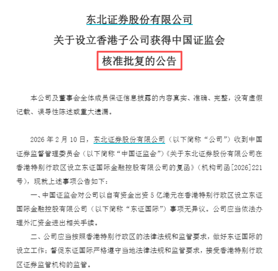 2月10日,东北证券收到中国证监会《关于东北证券股份有限公司在香港特别行政区设立东证国际金融控股有限公司的复函》。