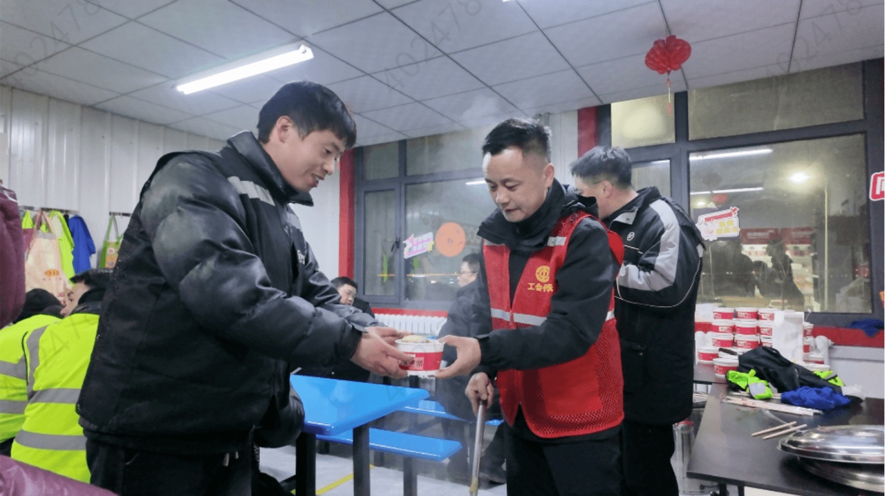 “大家辛苦了!这碗热饭,是感谢,更是敬意!”李龙为刚下流水线的员工端碗盛饭,围坐一起拉家常、问冷暖。他详细了解防寒保暖、轮班休息等情况,反复叮嘱:“效率要保,安全更要保;有困难,随时找工会!”