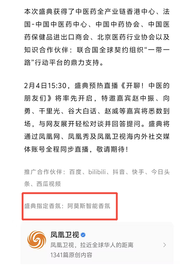 作为全球中医药文化盛典指定香氛品牌,阿莫斯智能香氛为该活动定制专属的中药香精油为核心,依托全场景智能香氛设备与自主研发的智慧物联香氛管理平台,为这场由凤凰卫视与东阿阿胶联合主办的文化盛事,打造了全景式嗅觉服务方案,让草本香韵成为传递中医药文化的隐形纽带,更以硬核科技实力,诠释源头品牌工厂的全产业链服务能力。