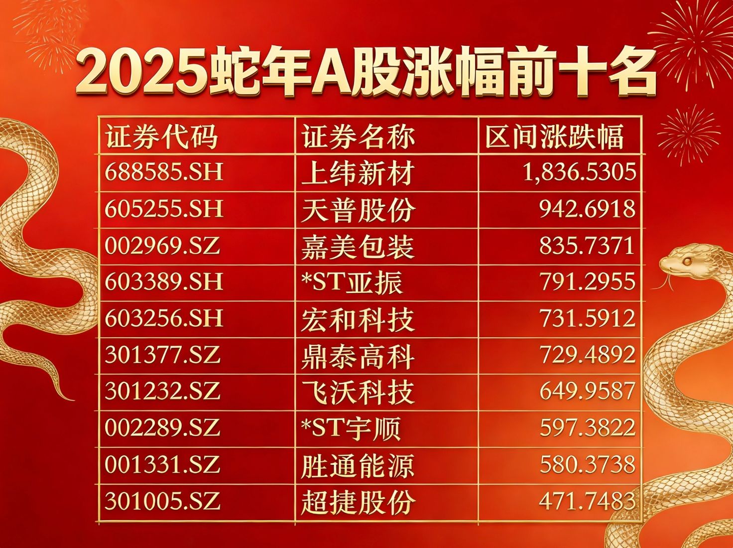 上纬新材、天普股份、嘉美包装成为蛇年涨幅前三个股。
