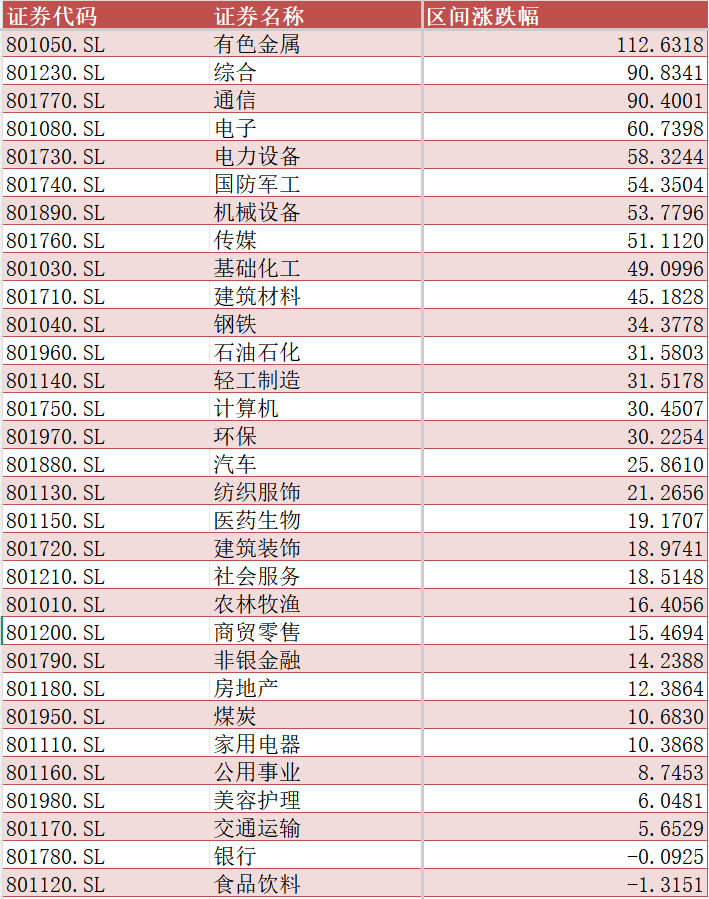 板块表现上,2025年申万一级行业中,有色金属以112%的涨幅位居首位。综合上涨90%,通信上涨90%,电子上涨60%,电力设备行业上涨58%。国防军工、机械设备、传媒上涨均超50%。基础化工、建筑材料则分别涨49%和45%。