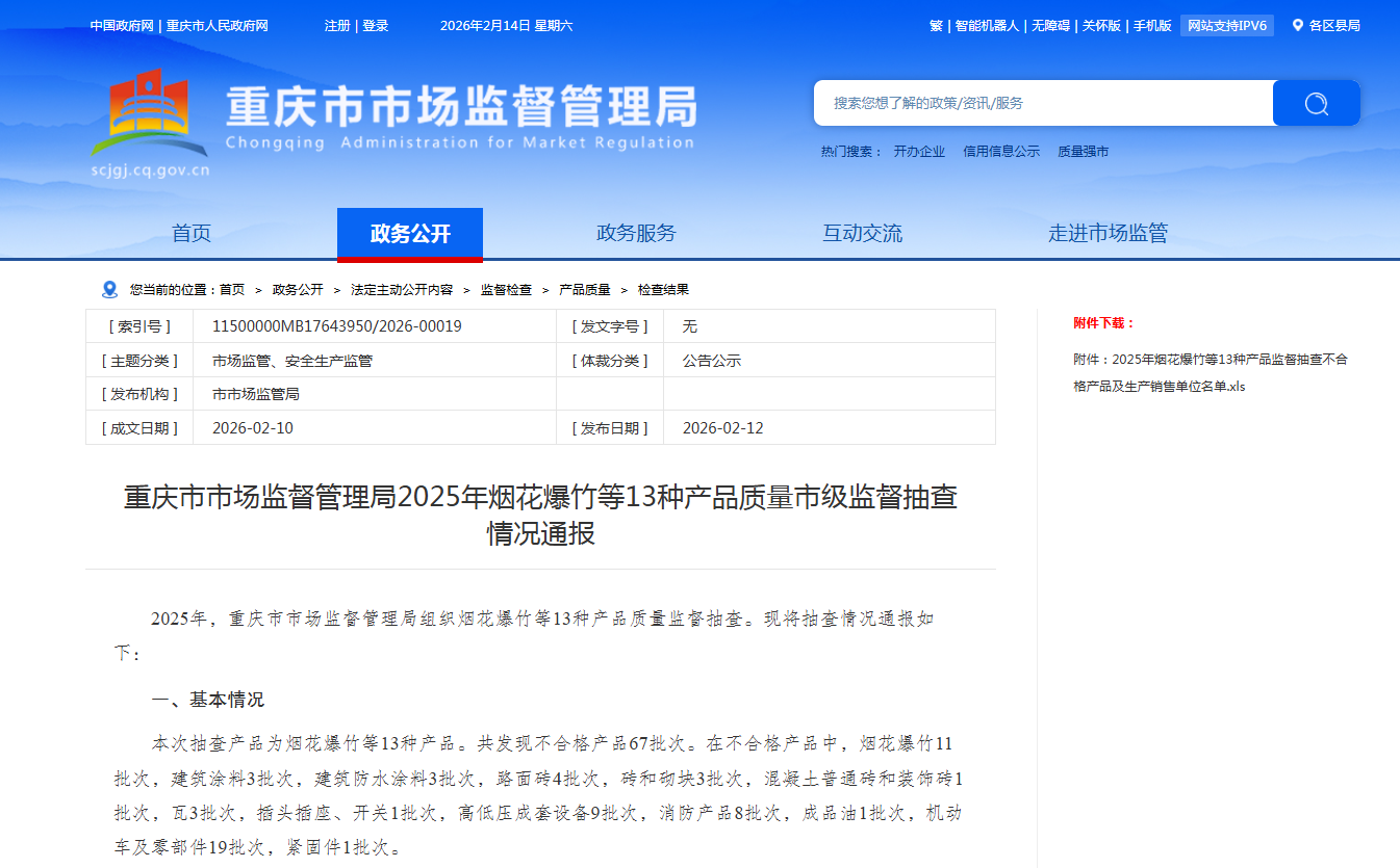 2025年,重庆市市场监督管理局组织烟花爆竹等13种产品质量监督抽查。现将抽查情况通报如下: