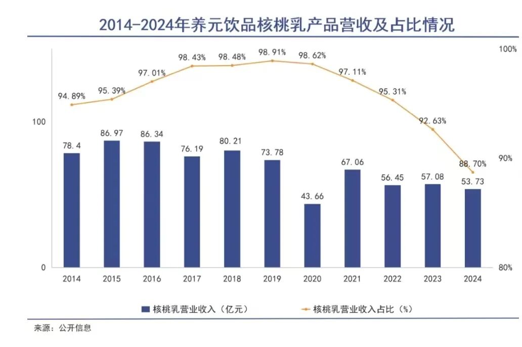 从2018年上市以来,核桃乳的营收占养元饮品主营业务收入的比重,一直居高不下,始终在90%以上,最高的几年占比一度超过98%。
