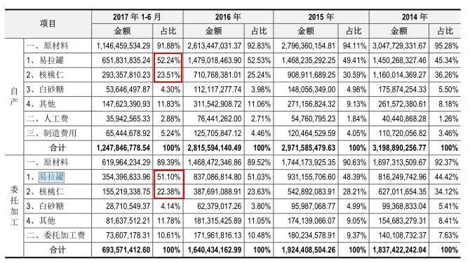同时,六个核桃的招股书也进一步揭示了产品的成本结构:每罐成本不到一块钱,其中易拉罐占比高达52.24%,而核桃仁仅占23.51%。也就是说,一罐产品的核桃仁成本仅约0.23元,这与六个核桃高端营养饮品的市场定位极其不匹配。