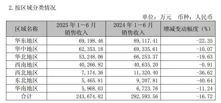 另据养元饮品2025年半年报显示,其上半年实现营业收入24.65亿,同比下降16.19%;实现归母净利润7.44亿,同比下降27.76%,首次出现营收与净利润双双下滑的局面。令人担忧的是,养元饮品在华东、华中、华北、西南、西北、东北、华南七个大区的销售收入全线下滑。