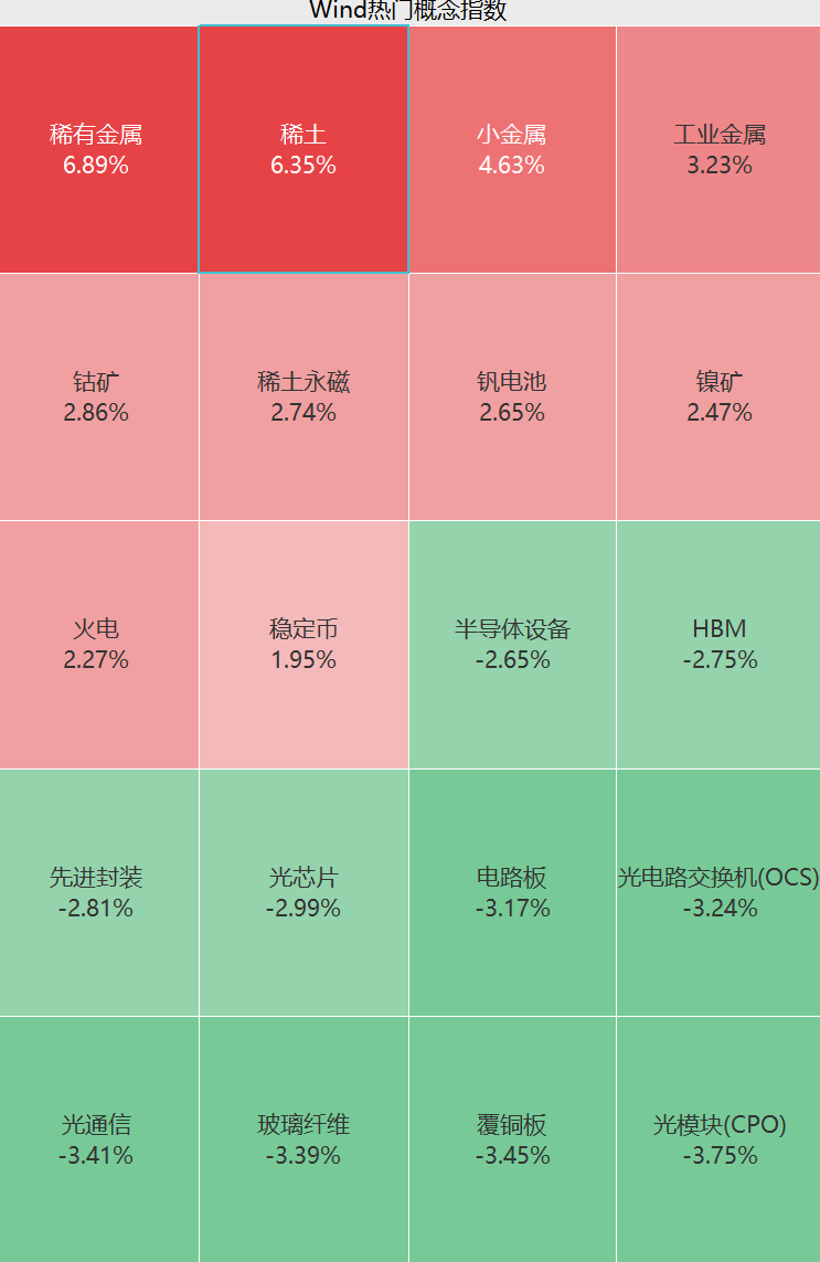 盘面上,上午钢铁、有色金属、煤炭等板块走高,稀土、小金属、工业金属等概念股活跃;通信、电子板块下挫,光模块、光通信、光芯片等概念股回调,部分前期高位股盘初跳水。