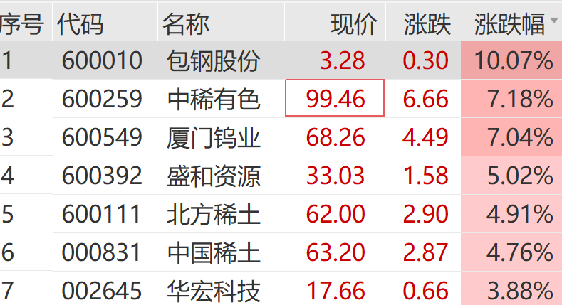 稀土概念股火热,包钢股份盘中触及涨停,中稀有色、中国稀土、北方稀土纷纷走强。