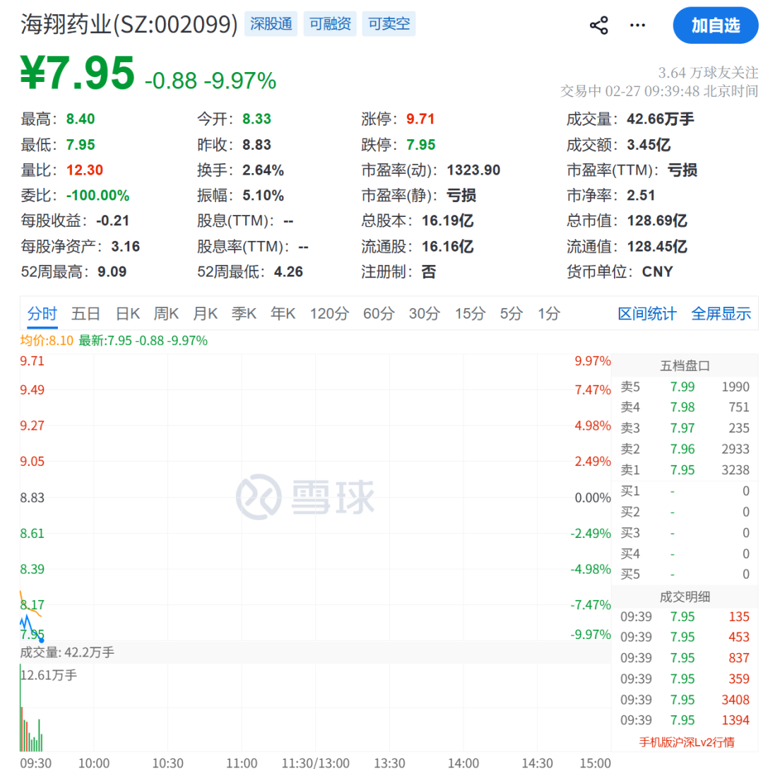 昨日涨停的海翔药业,今日跳水跌停。