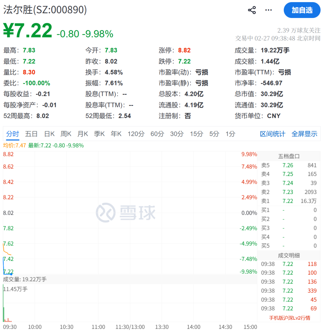此前4连板的法尔胜,开盘1分钟跳水跌停,报7.22元/股。