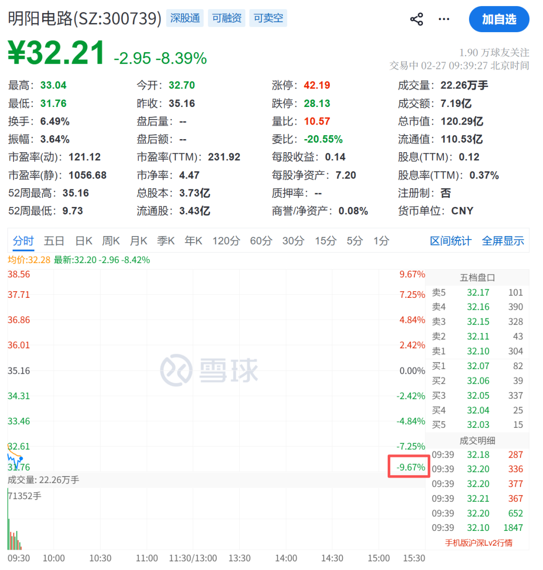 昨日20cm涨停的明阳电路,盘初跌超9%。