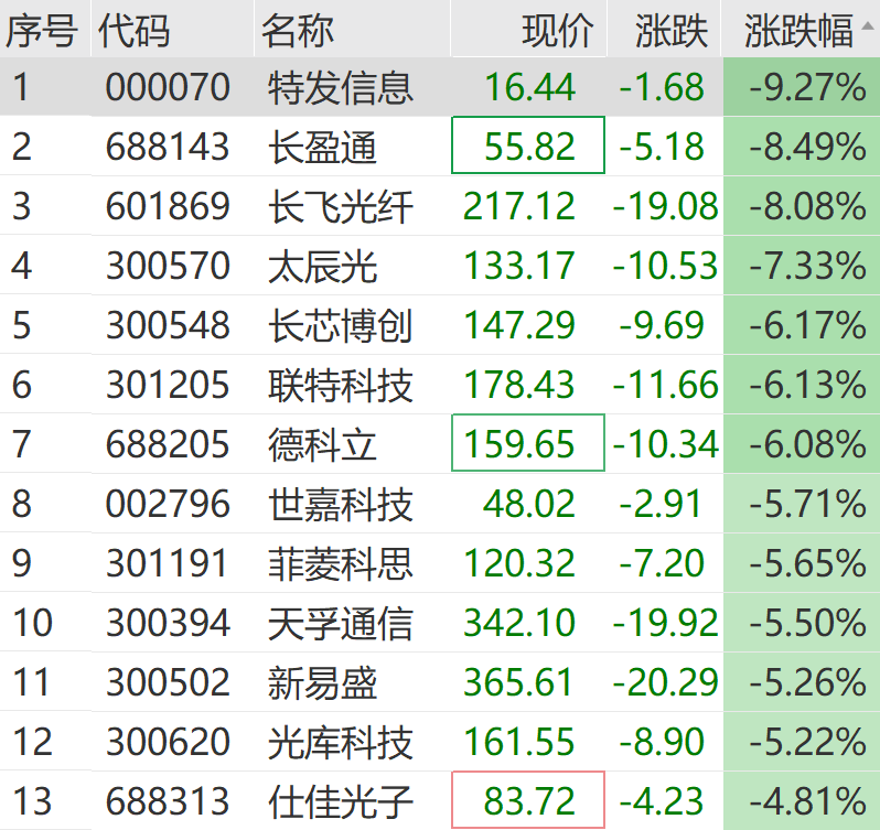 个股方面,特发信息、长飞光纤、太辰光、德科立、天孚通信、新易盛等纷纷走低。