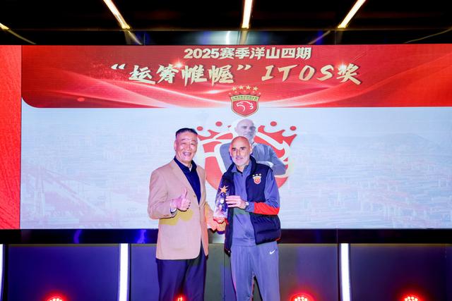海港主帅穆斯卡获“中控统筹”智慧奖,上海市足协主席柳海光颁奖。