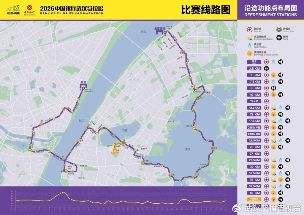 2026武汉马拉松对赛道进行优化升级,首次实现武汉7个中心城区全覆盖,打造在长江“北岸起跑,南岸冲刺”的独一无二体验,让42.195公里的赛道成为串联城市江景地标的流动画卷。