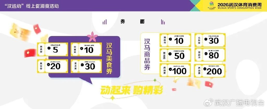 为落实体育惠民政策,进一步提振体育消费,2026武汉体育消费周期间将持续举办“汉运动”线上促消费活动,通过“汉运动”微信小程序发放1000万元体育消费券,精准触达在汉体育消费人群,打造“一券在手,畅享实惠”的体育消费新体验。