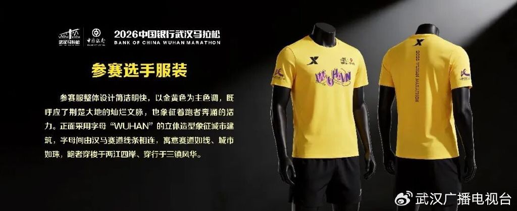 参赛服整体设计简洁明快,以金黄色为主色调,既呼应了荆楚大地的灿烂文脉,也象征着跑者奔涌的活力。正面采用字母“WUHAN”的立体造型象征城市建筑,字母间由汉马赛道线条相连,寓意赛道如线、城市如珠,跑者穿梭于两江四岸、穿行于三镇风华。