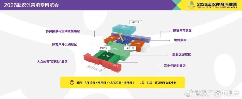 作为本届消费周的核心载体,2026武汉体育消费博览会将于3月19日—22日在武汉国际会展中心举办,展会总面积达3.2万平方米。展会以“体育引领、促进消费、拉动经济”为核心,紧扣武汉体育产业发展特色,设置大众体育“汉运动”、青少年培训、路跑之城、冰雪户外运动、电竞展区、数智体育、体育健康与运动康复展区七大特色展区,打造“赛、食、赏、购”一体化的立体消费场景。