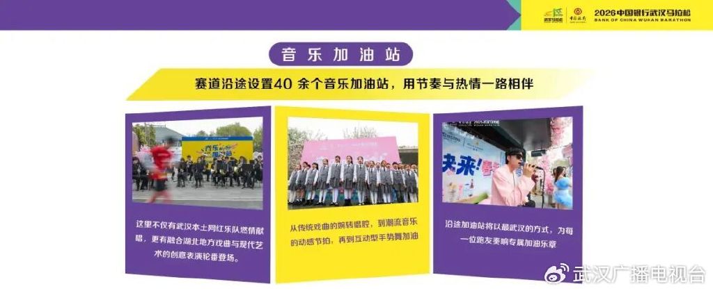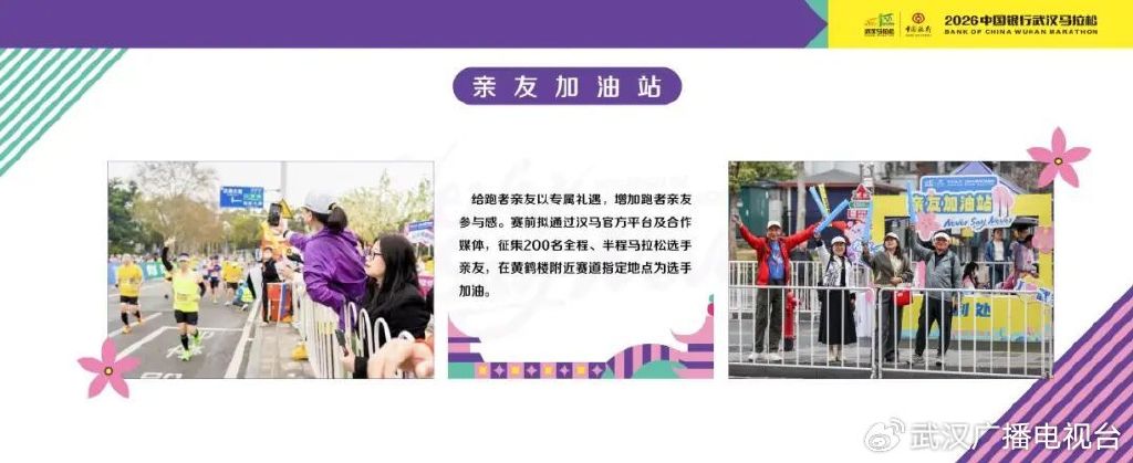 赛道文化体验持续丰富,本届汉马将设置40余个特色音乐加油站,不仅有武汉本土网红乐队燃情献唱,更有融合非遗特色的创意表演轮番登场,让跑者在奔跑中感受荆楚文化的独特魅力;继续举办“汉马亲友团”活动,招募200余名跑者亲友组成加油团,在汉马黄鹤楼赛段与跑者击掌互动,增添赛事温情。