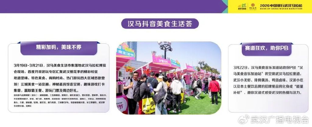 2026年,在武汉市商务局、武汉市体育局指导下,武汉体育消费周联合抖音生活服务,以“美食”为媒介,以“生活”为主题,打造一场集美食、休闲、游玩于一体、线上线下相结合的美食盛宴。抖音主会场将发放武汉美食专属优惠,线下将在2026武汉体育消费博览会期间打造“汉马美食生活市集”,汇聚武汉本土老字号、网红品牌,让跑者品尝地道江城滋味;抖音《汉马美食生活地图》同步升级,精准推荐武汉大街小巷的特色美食。
