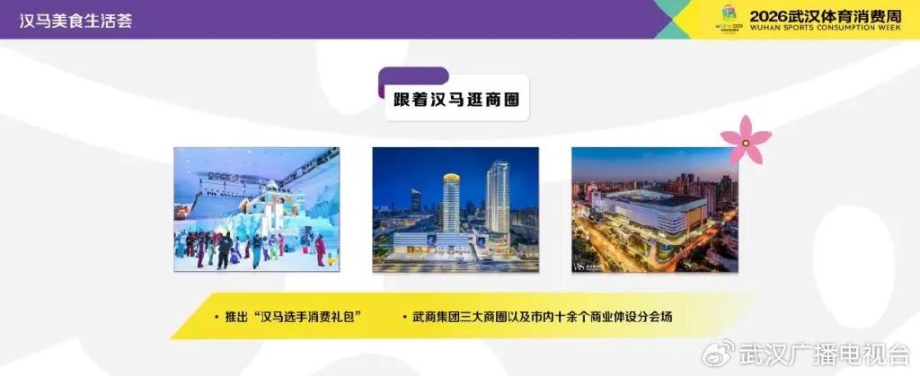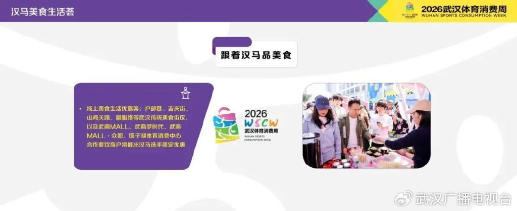 “汉马美食生活荟”美味焕新,2026武汉体育消费周与多个传统美食街区以及市内多家商业体开展全方位联动,武商集团旗下武商MALL、武商梦时代、武商MALL·众圆内的特色餐饮商户、优质品牌资源,将推出丰富的汉马美食套餐、发放消费优惠券,为参赛选手及市民打造“体育+美食+购物”的多元消费场景。此外,武汉SKP、群光广场、迪卡侬、塔子湖体育消费中心等重点商圈、商业体也将同步开展武汉体育消费周主题促消费活动,形成全城联动的消费热潮。