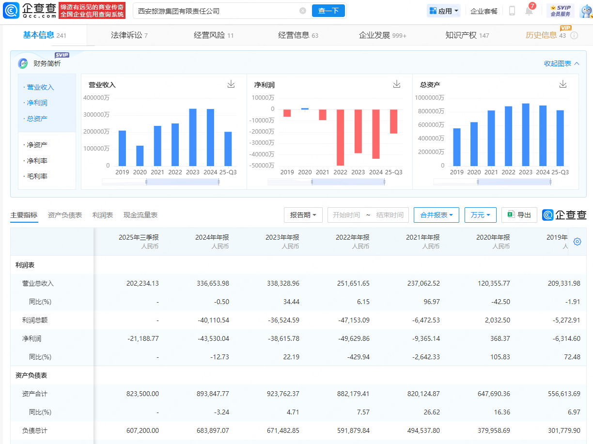 更令人担忧的是,西安旅游身后的“输血者”——母公司“西旅集团”的业绩表现已经疲态尽显。企查查数据显示,2023年—2025年上半年,该集团净利润分别为-3.86亿元、-4.35亿元、-1.87亿元;资产负债率则分别为72.69%、76.51%、76.34%。