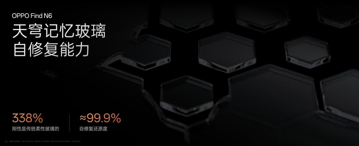 未来的折叠屏玻璃,不仅要够「柔」,更需要「刚」。OPPOFind N6搭载了全新升级的天穹记忆玻璃,其刚性是传统柔性玻璃的3倍以上,当它被弯折再展开的时候,具备99.9%的自修复还原度。如同记忆枕头一般,在弯折后能够快速自动回弹、修复折痕。而且这种自修复能力极具持久性,即便经历60万次折叠,依然能保持稳定,成为屏幕久用平整的核心保障。