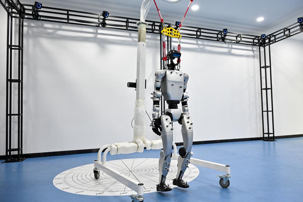 2025年7月3日,在位于安徽省芜湖市的埃夫特智能机器人股份有限公司内,一款人形机器人在动作捕捉设备帮助下进行训练。新华社记者 张铖 摄
