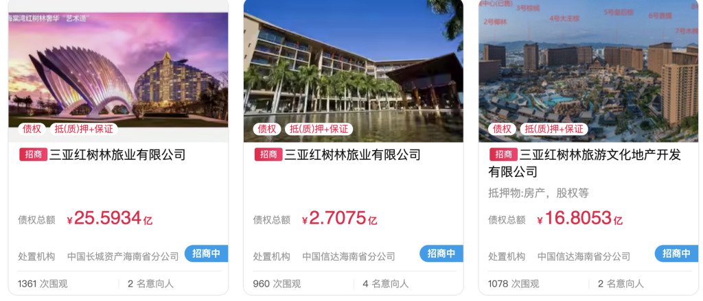 3月16日,据阿里资产平台披露的信息显示,三亚红树林系两大债权资产包被摆上货架,对应拍卖标的为三亚红树林旅业有限公司和三亚红树林旅游文化地产开发有限公司的债权,两家公司三笔债权总额达45亿元。