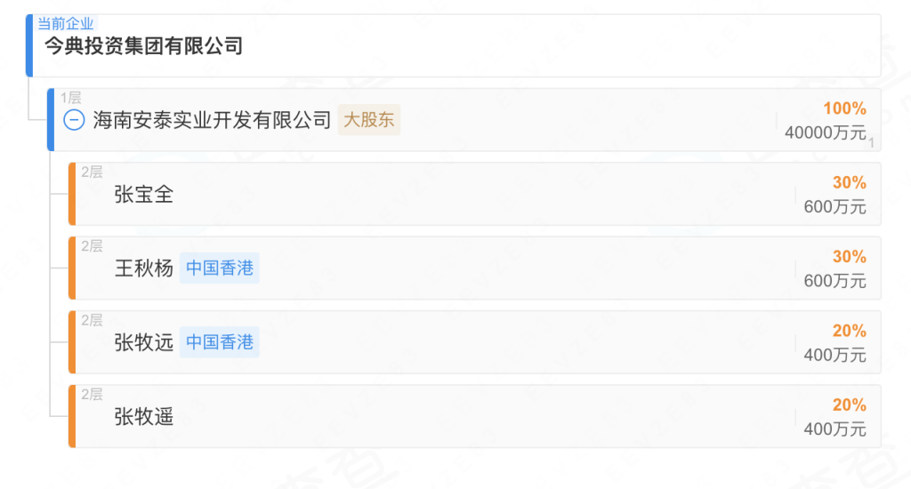企查查披露的信息显示,今典投资集团有限公司成立于2022年5月8日,注册资本4亿元,法定代表人为张宝全,公司唯一股东为海南安泰实业开发有限公司。