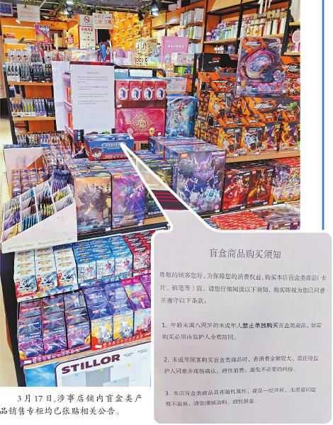 《指引》规定:“盲盒经营者应当将商品名称、商品种类、商品样式、抽取规则、商品分布、限量商品投放数量、抽取概率、商品价值范围等关键信息以显著方式对外公示,保证消费者在购买前知晓”“盲盒经营者应当以显著方式提示8周岁及以上未成年人购买盲盒需取得相关监护人同意”。但记者走访的商店货架旁,均未看到放置盲盒商品销售说明及相关年龄限制条款标识,盲盒外包装上也没有相关提醒。