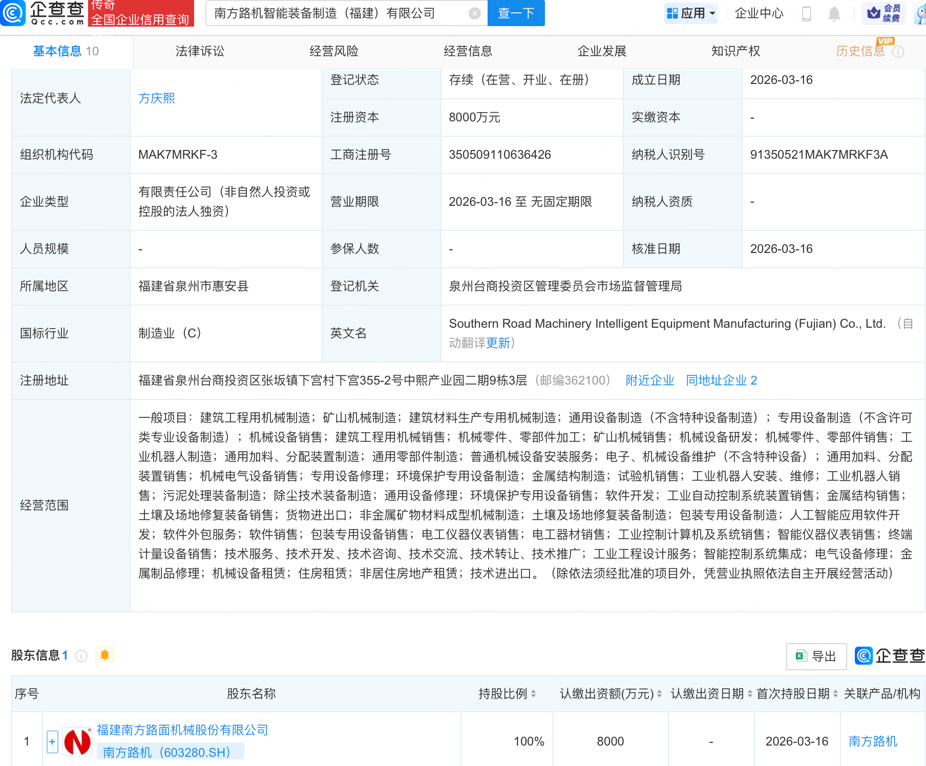 企查查APP显示,近日,南方路机智能装备制造(福建)有限公司成立,注册资本8000万元,经营范围包含:人工智能应用软件开发;软件外包服务;软件销售;包装专用设备销售;电工仪器仪表销售等。企查查股权穿透显示,该公司由南方路机(603280.SH)全资持股。