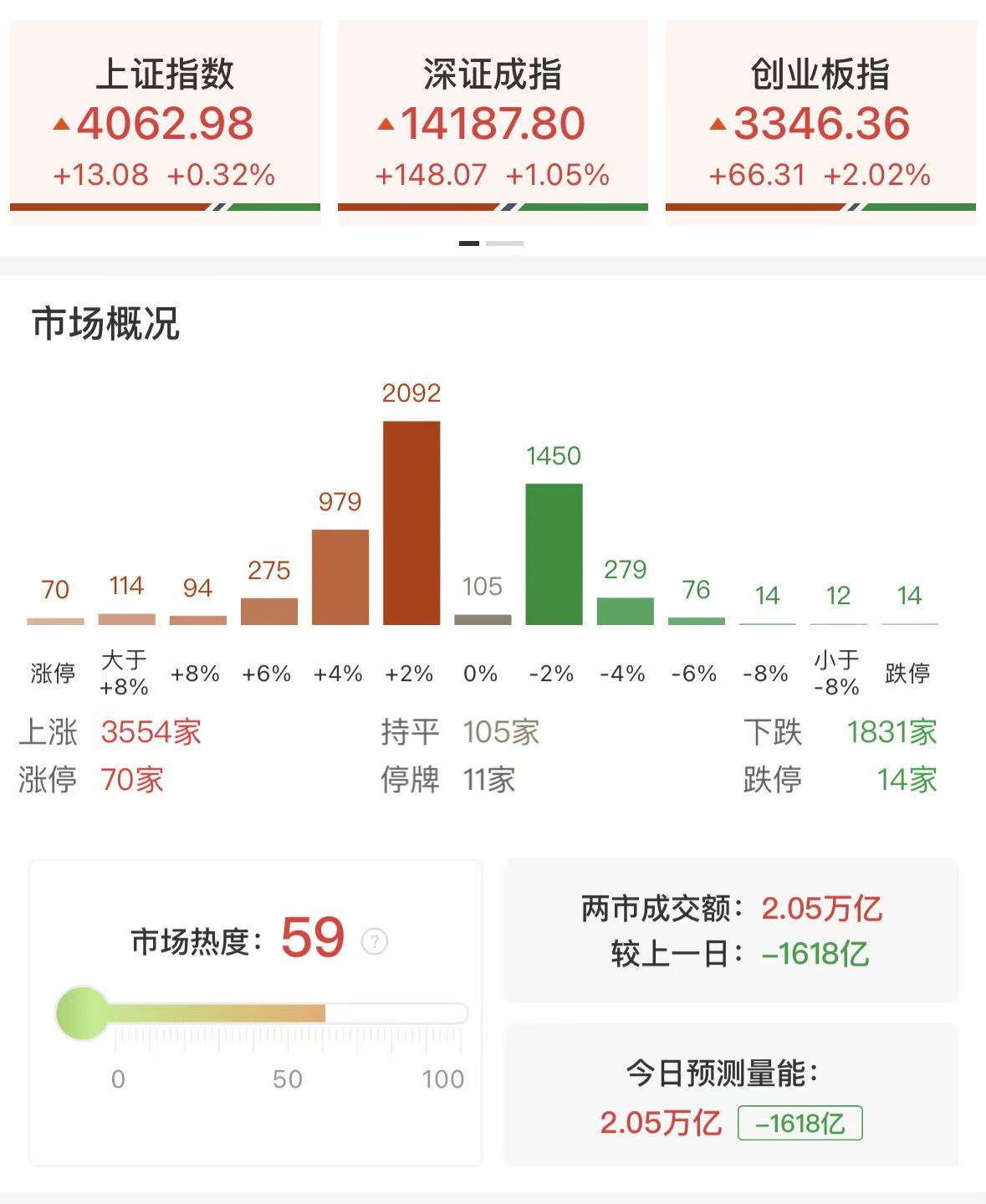 财联社3月18日讯,三大指数集体收红,沪指终结日线4连阴,深成指涨逾1%,创业板指涨超2%。沪深两市成交额2.05万亿,较上一个交易日缩量1618亿。盘面上,市场热点快速轮动,情绪出现回暖,全市场超3500只个股上涨。从板块来看,算力产业链爆发,其中CPO概念全线反弹,“易中天”光模块三巨头均大涨,瑞斯康达7天4板,可川科技3天2板。算力租赁概念走强,数据港、中贝通信、云赛智联涨停。算电协同概念表现活跃,韶能股份、粤电力A封一字涨停。存储芯片概念走高,朗科科技3天2板,佰维存储涨超9%续创历史新高。下跌方面,油气股走弱,洲际油气、通源石油等多股大跌。化工板块下挫,金牛化工、泸天化跌停。截至收盘,沪指涨0.32%,深成指涨1.05%,创业板指涨2.02%。