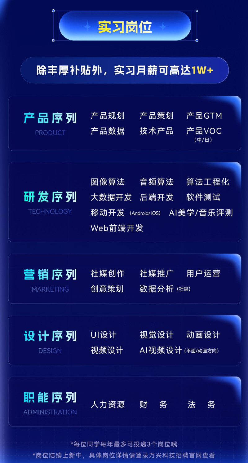 长沙晚报掌上长沙3月18日讯(全媒体记者 刘攀)近日,AIGC软件A股上市公司万兴科技(300624.SZ)宣布升级校园招聘体系,全面启动2026实习生招聘,面向2027届及后续学年毕业的本科、硕士及博士在校生开放1000+实习Offer,覆盖产品、研发、营销、设计与职能五大类方向,是公司持续践行“拿深圳同等高薪、住长沙宜居房子、干全球AI事业”人才战略的重要举措。