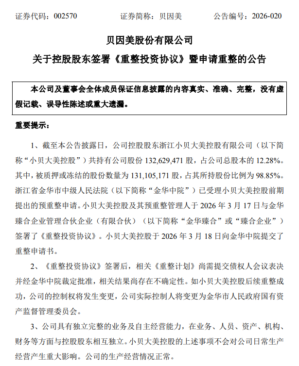 3月18日,贝因美再发重整公告表示:“公司控股股东“小贝大美”已与金华臻合企业管理合伙企业(有限合伙)(简称“金华臻合”)签署《重整投资协议》,计划投资金额8.56亿元。若后续重整成功,公司实控人将变更为金华市国资委。”