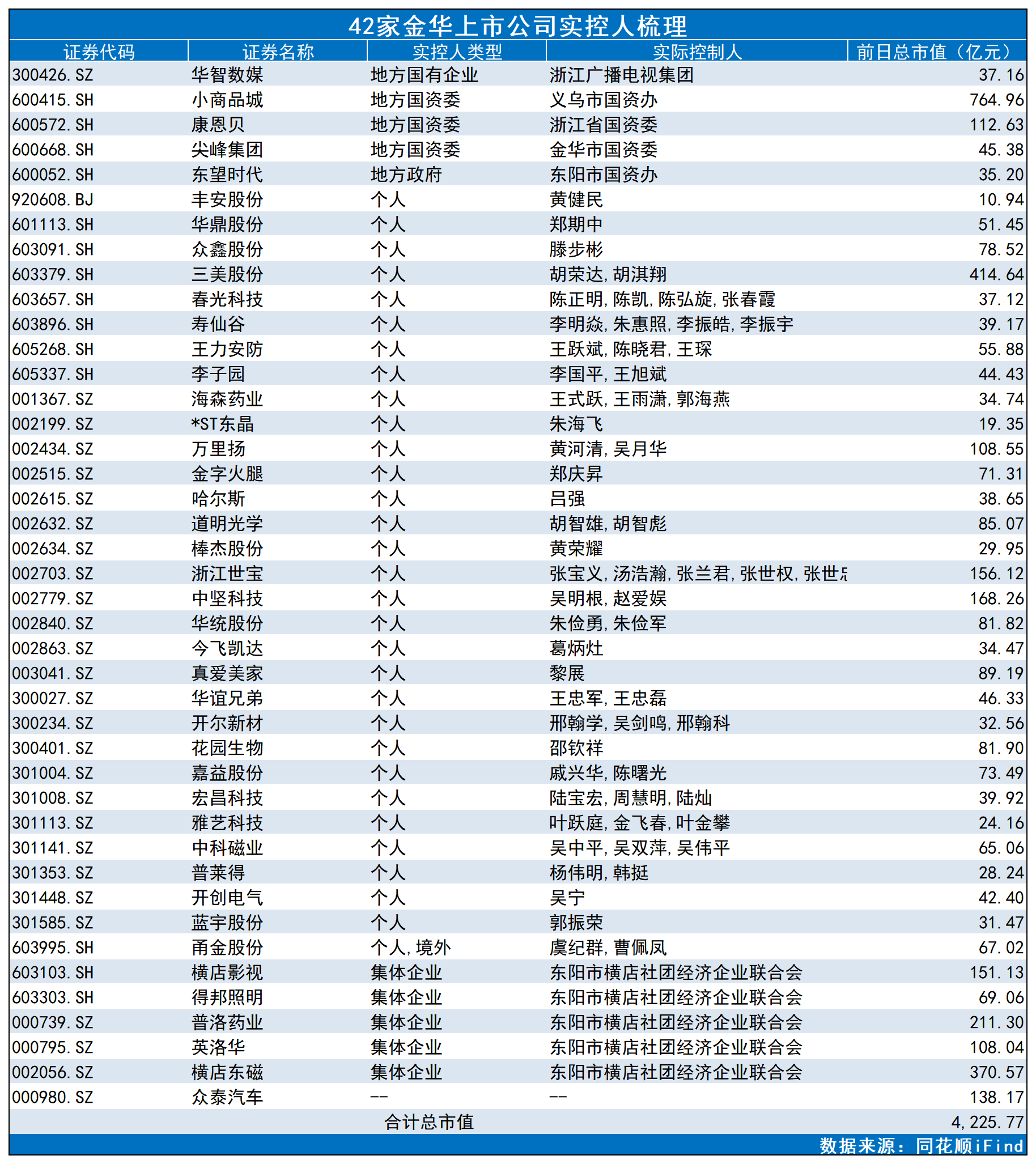 而在42家金华上市公司中,实际控制人为地方政府、国资委、地方国企仅5家,分别为东望时代(600052.SH)、小商品城(600415.SH)、康恩贝(600572.SH)、尖峰集团(600668.SH)、华智数媒(300426.SZ)。穿透后发现,仅尖峰集团实控人为金华市国资委。