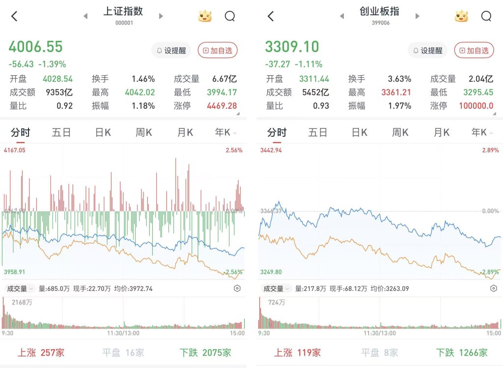 至收盘,上证综指跌1.39%,报4006.55点;科创50指数跌2.44%,报1339.03点;深证成指跌2.02%,报13901.57点;创业板指跌1.11%,报3309.1点。
