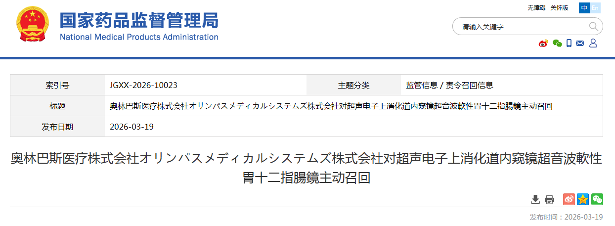 奥林巴斯贸易(上海)有限公司报告,由于产品使用说明书更新后不再与部分内镜清洗消毒装置兼容使用等原因,生产商奥林巴斯医疗株式会社オリンパスメディカルシステムズ株式会社对其生产的超声电子上消化道内窥镜超音波軟性胃十二指腸鏡(国械注进20163063057)主动召回。召回级别为二级召回。涉及产品的型号、规格及批次等详细信息见《医疗器械召回事件报告表》。