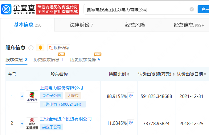 企查查显示,上述两家公司均为国家电投集团江苏电力有限公司控股公司,后者由上海电力持股88.92%。