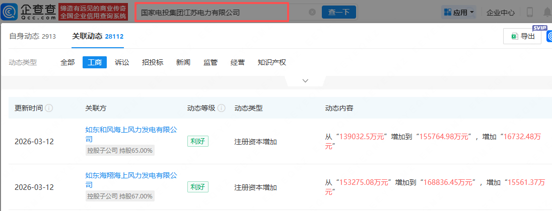 企查查APP显示,近日,如东和风海上风力发电有限公司、如东海翔海上风力发电有限公司发生工商变更,注册资本分别增加至15.58亿元、16.88亿元。