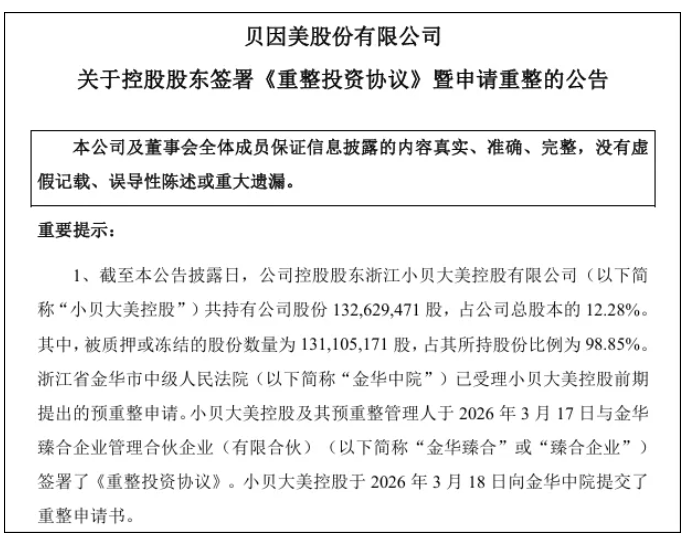 “奶粉第一股”贝因美(维权)重整迎来终局。3月18日晚,贝因美披露,其控股股东小贝大美控股已签署《重整投资协议》,确认金华臻合企业管理合伙企业(有限合伙)为重整投资人。若重整最终成功,贝因美实控人将变更为金华市国资委。