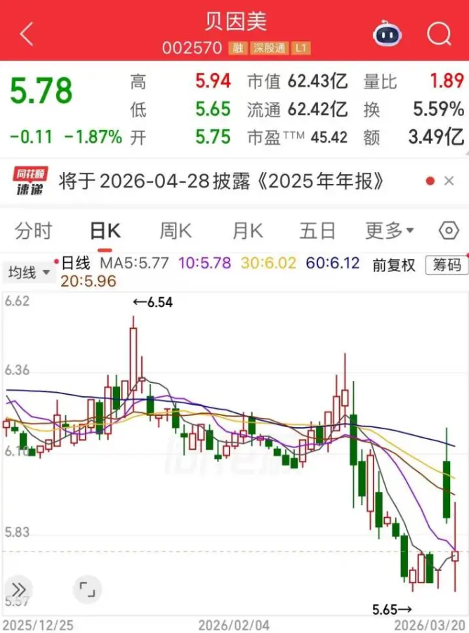 国资入局,市场反应强烈,3月19日,在全市场超5000只个股下跌的情况下,贝因美录得2.97%的涨幅,报价5.89元/股。3月20日下跌1.87 %,收盘报价5.78元/股。
