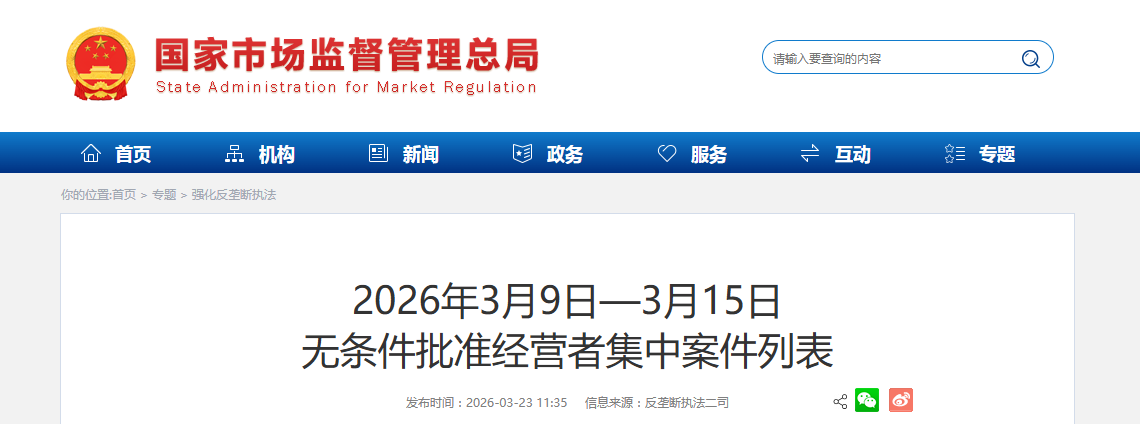 | 1 | 青岛高速集团有限公司与中国石化销售股份有限公司新设合营企业案 | 青岛高速集团有限公司,中国石化销售股份有限公司 | 2026年3月9日 |