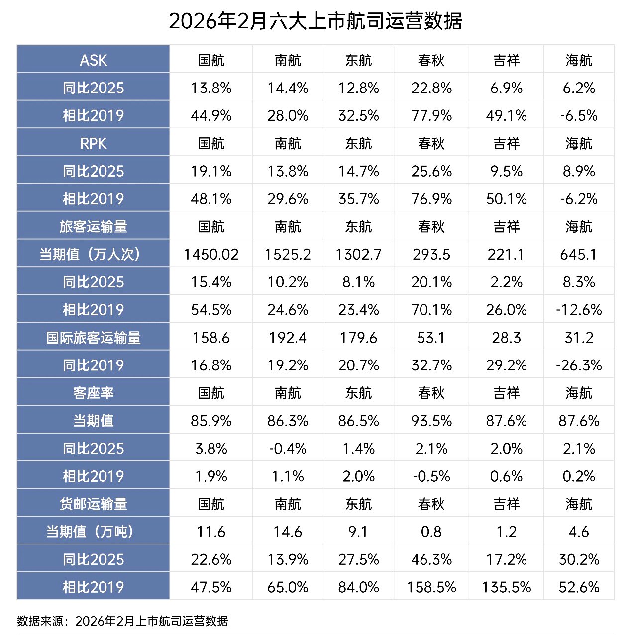 货邮运输量大幅增长。与2025年同期相比,各航司货运量增速在13.9%至46.3%之间。若与2019年相比,数据提升则更为明显:国航增长47.5%,海航增长52.6%,南航增长65.0%,东航增长84.0%。而基数较小的民营航司更是实现了翻倍式跨越,吉祥航空暴增135.5%,春秋航空更是创下158.5%的惊人增幅。货运业务的强劲表现,不仅为航司贡献了可观的增量收入,也有效平滑了客运市场的季节性波动风险。(丁文墨)